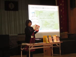 児童の皆さんに身近な本や、図書館職員のおすすめの本を紹介しながら、